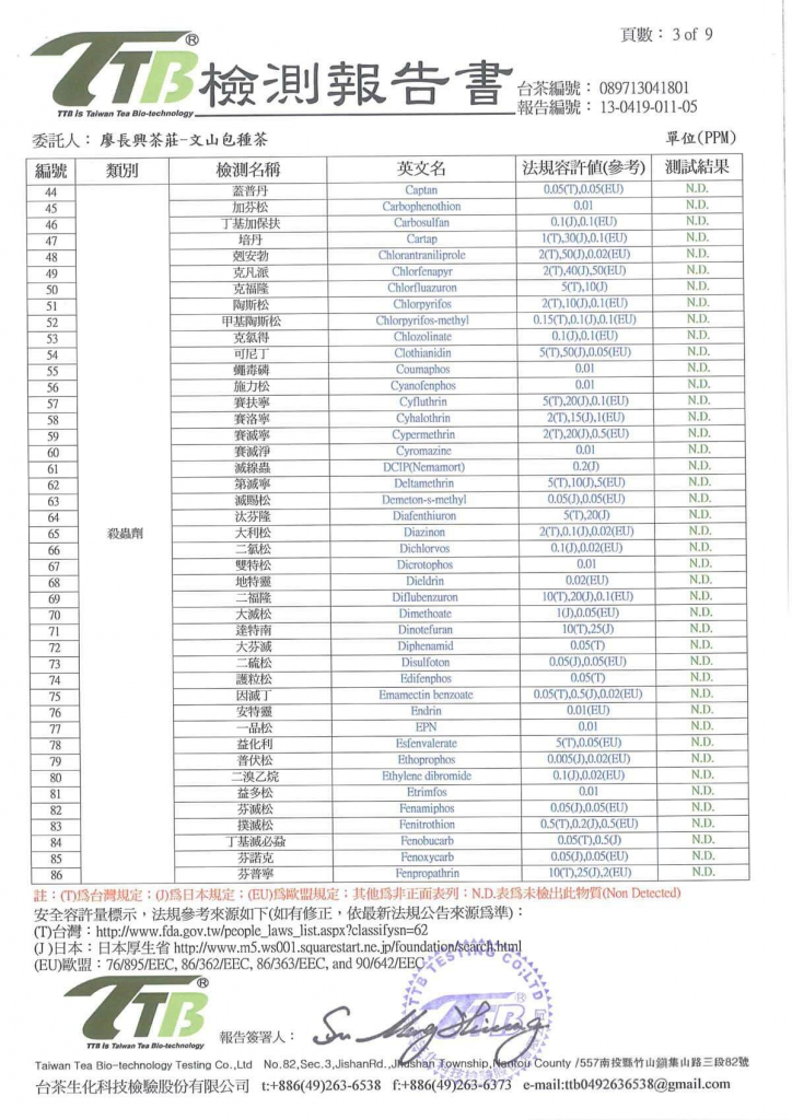 2013年包種茶農藥檢測報告作者: 廖長興茶業 農藥檢測報告,本店符合台灣檢測標準 各位茶友您好,本店2013年春茶檢驗報告已經完成。本次委託【台茶生化科技檢驗股份有限公司】,共進行331項茶葉農藥檢測,檢驗結果符合台灣、日本及歐盟標準。購茶時本店會附上檢驗報告,歡迎茶友放心選購。