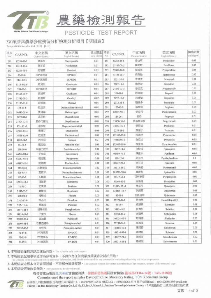 2014年包種茶農藥檢測報告作者: 廖長興茶業 各位茶友您好,本店2014年春茶檢驗報告已經完成。本次委託【台茶生化科技檢驗股份有限公司】進行檢測,檢驗結果符合標準。購茶時本店會附上檢驗報告,歡迎茶友放心選購。 若您有出口需求,歡迎來電索取檢測報告。以下是台灣檢測報告,也歡迎顧客自行下載PDF檔。有任何問題歡迎洽詢。